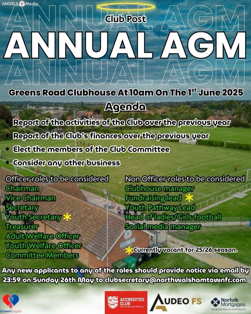 Can you step up and help on our commitee we are looking for a new youth secretary and a new fundraising league! Please contact clubsecretary@northwalshamtownfc.com if you are interested.